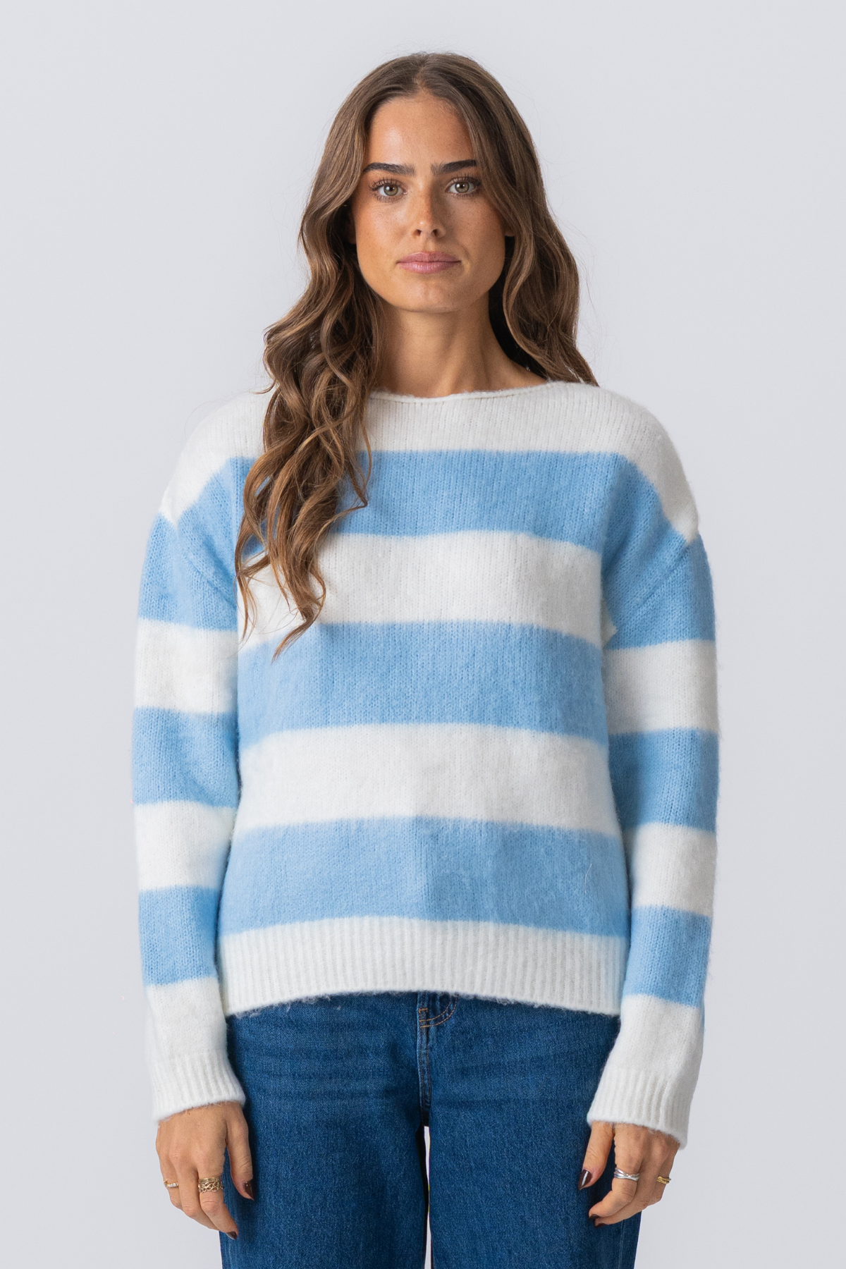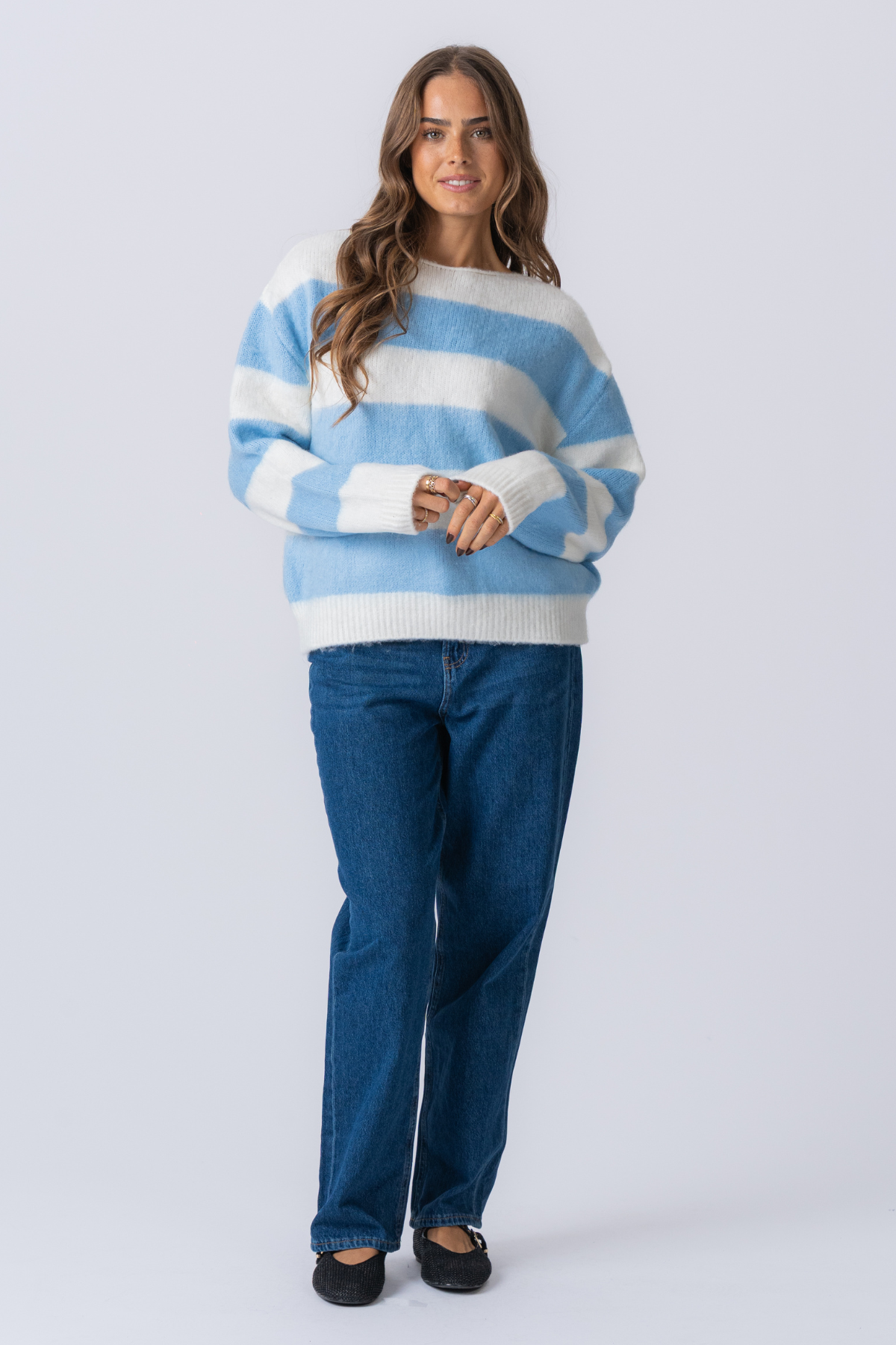 Celina gestreifte Strickpullover - Weiß/Himmelblau