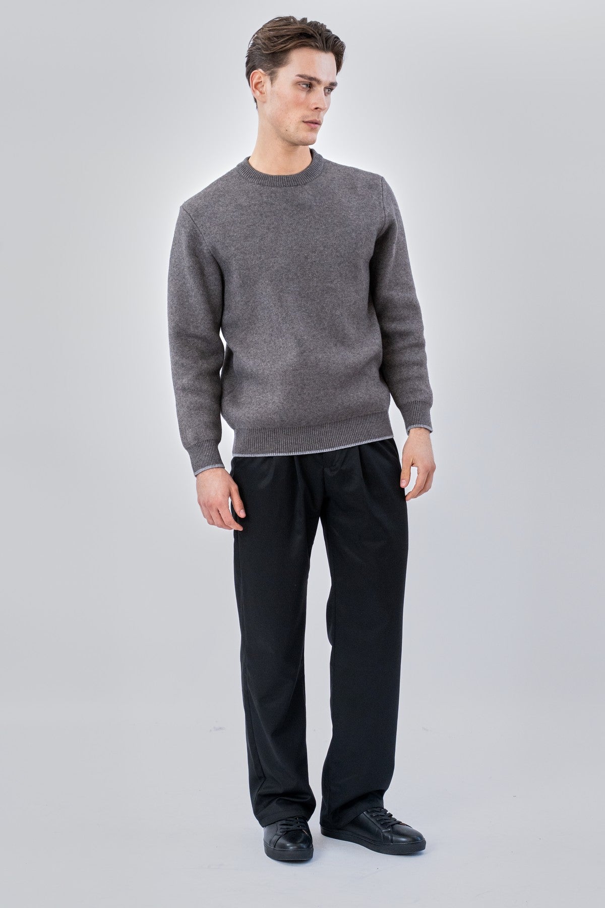 Die Schönheit dieses Rundhalspullovers liegt in seiner Vielseitigkeit. Der klassische Grauton dient als neutrale Grundlage, die jedes Outfit ergänzt. Für einen eleganten, professionellen Look tragen Sie diesen Pullover über einem unserer Crisp-Pullover Hemden um Textur und Wärme hinzuzufügen, ohne aufzutragen. Wenn Sie eine entspanntere Ästhetik anstreben, lässt es sich nahtlos mit Ihrer Lieblings-Denim- oder Casual-Jeans kombinieren Pants. Die klaren Linien des Rundhalsausschnitts umrahmen das Gesicht perfekt und sorgen für eine zeitlose Silhouette, die nie aus der Mode kommt.